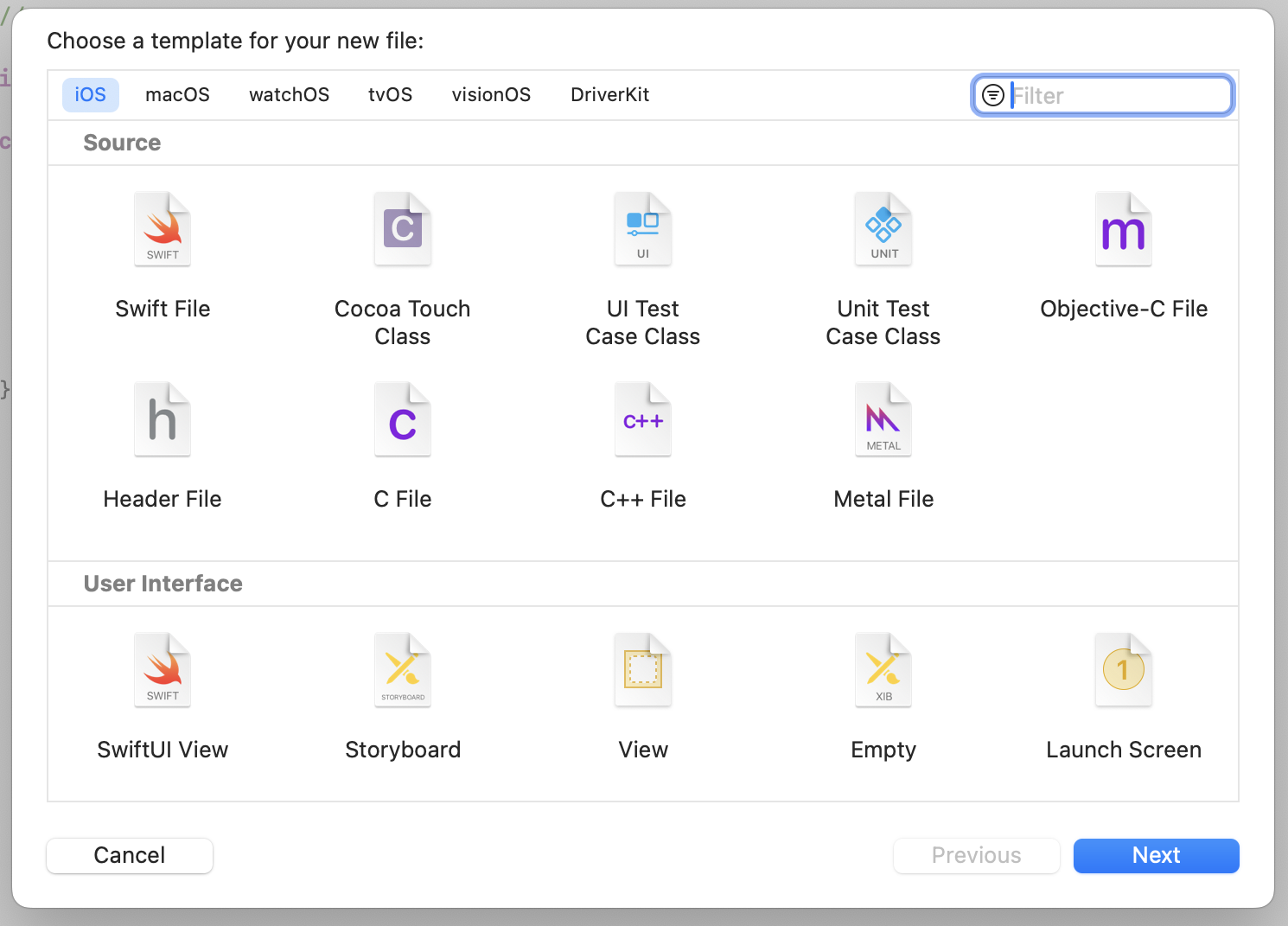 Xcode를 다시 실행하면, 새로운 파일을 생성할 때 사용자 정의 템플릿을 선택할 수 있습니다.